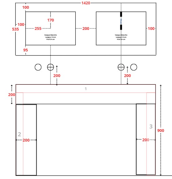 Je souhaiterai réaliser un plan vasque avec 2 vasques à encastrer par dessus posé sur deux jambes.