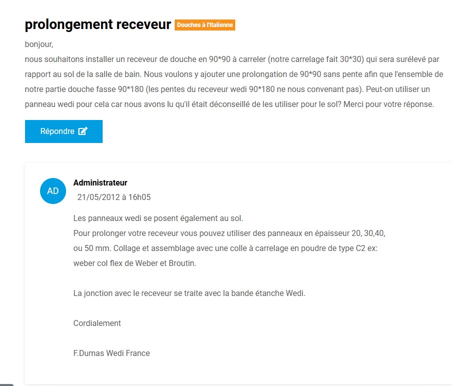 Question 2: peut on “prolonger” le receveur de 140 cm de long par un panneau mural (pour ne pas avoir les pentes d'écoulement) de 140 cm de long et de même épaisseur que le receveur en faisant une étanchéité avec une bande étanche WEDI (cf. PJ)
