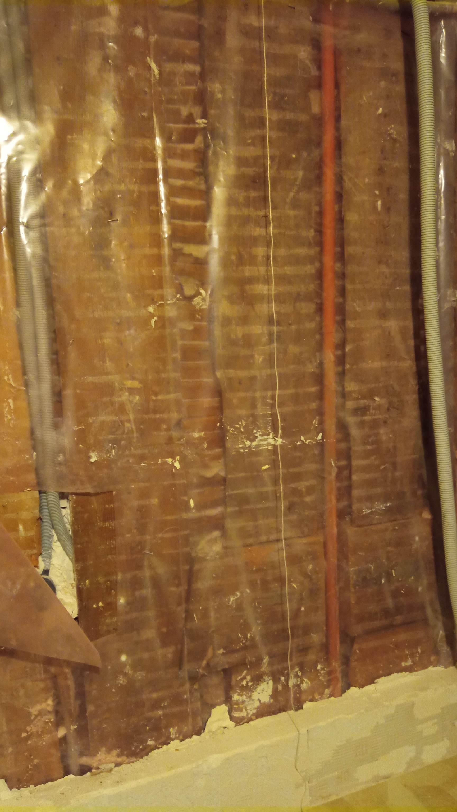 Je rénove une salle de bain. J'ai démonté les cloisons de l'ancienne baignoire en béton cellulaire car elles avaient pris l'eau et les joints ne tenaient plus (le mur bougeait lorsque j'appuyais dessus). En dessous, je me retrouve avec une armature en bois (cloison à l'ancienne - cf photo), qui, de l'autre côté de la cloison, servent à un support lattis + plâtre. Le tout est plus ou moins droits, avec des surépaisseur dues aux graines techniques.
